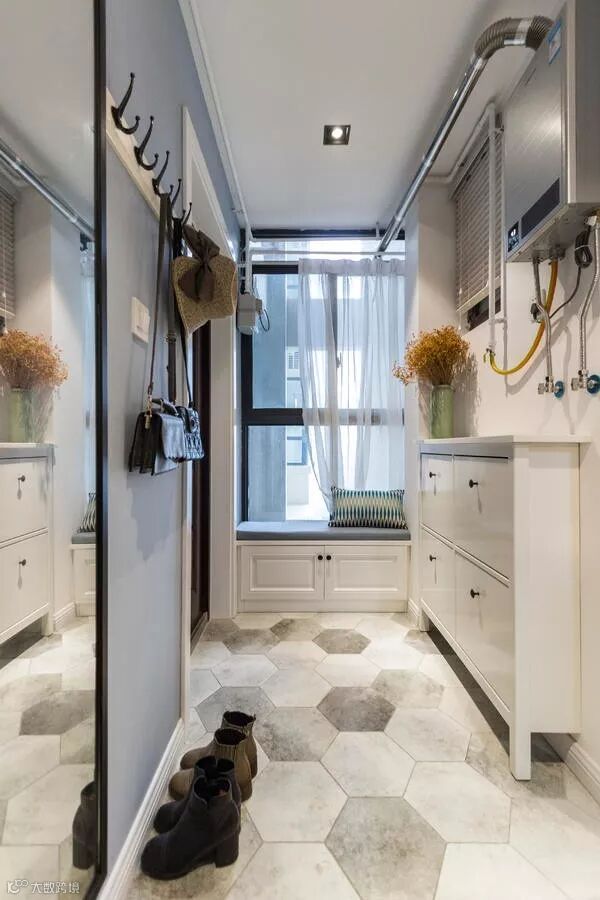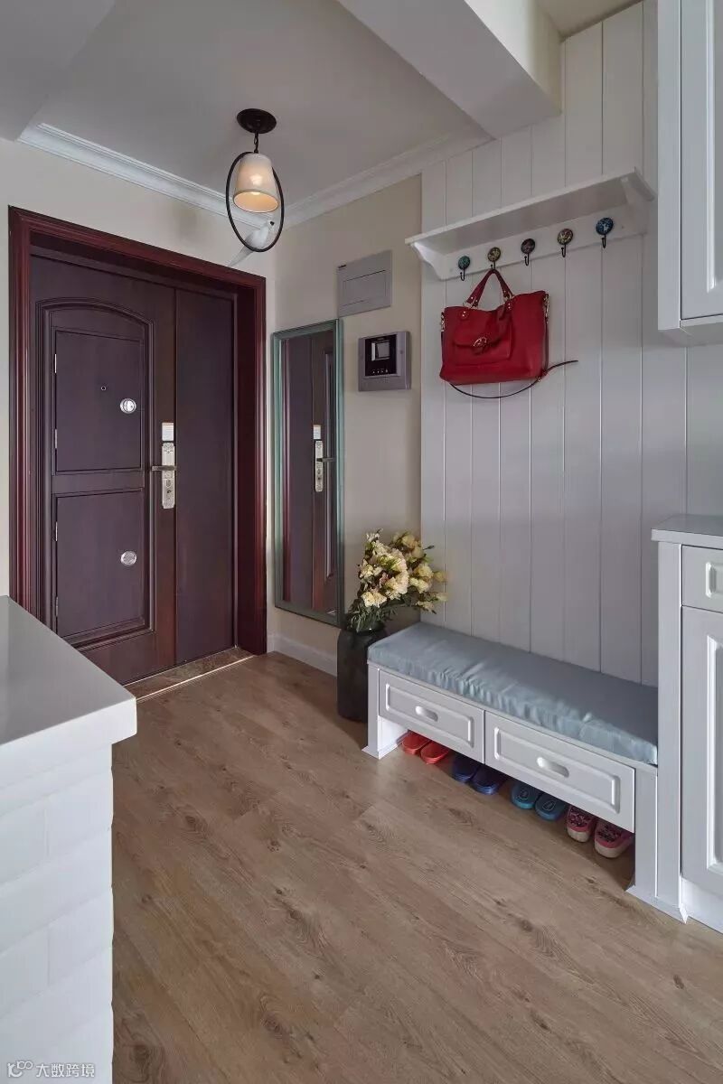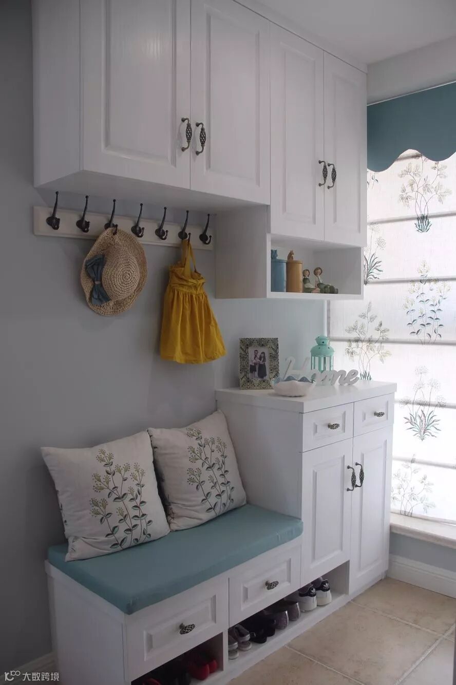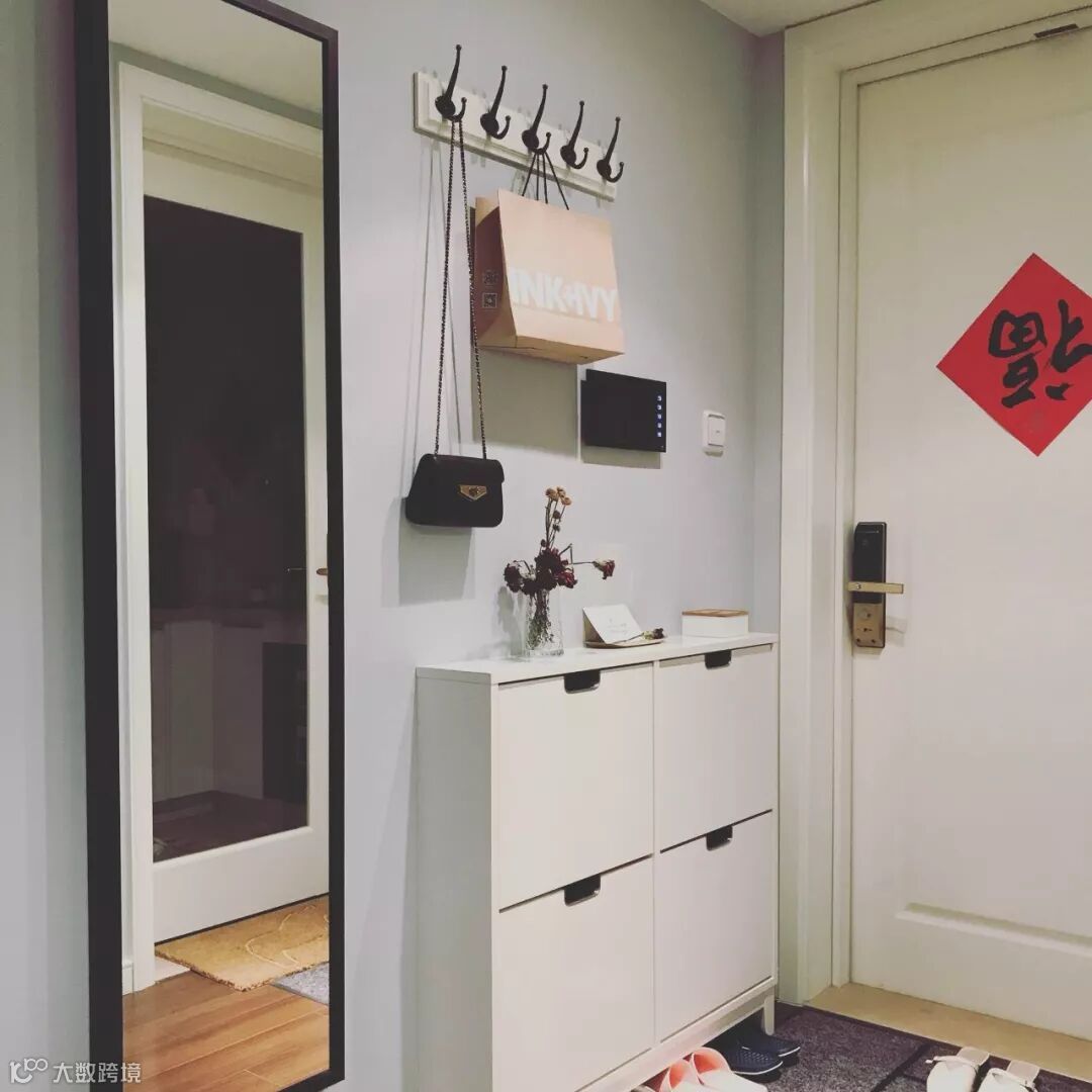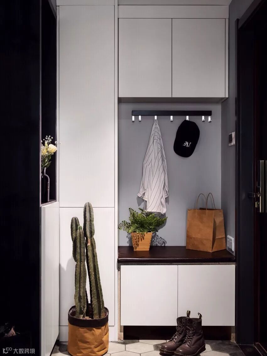 如果不装定制鞋柜,摆上成品鞋柜的话,那么矮柜鞋柜上方的空墙,也是可以用来安装挂钩的。