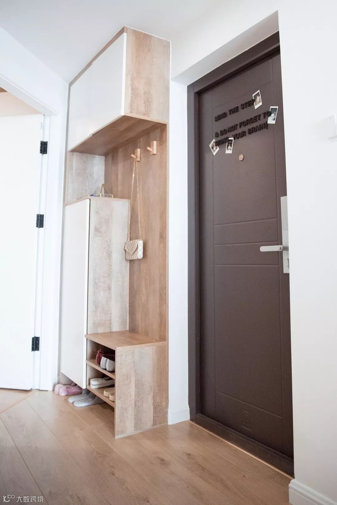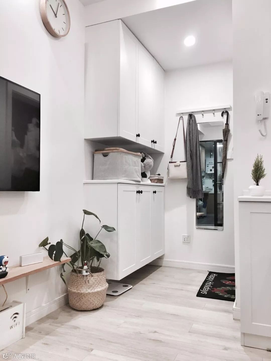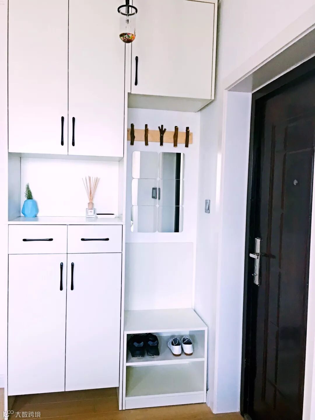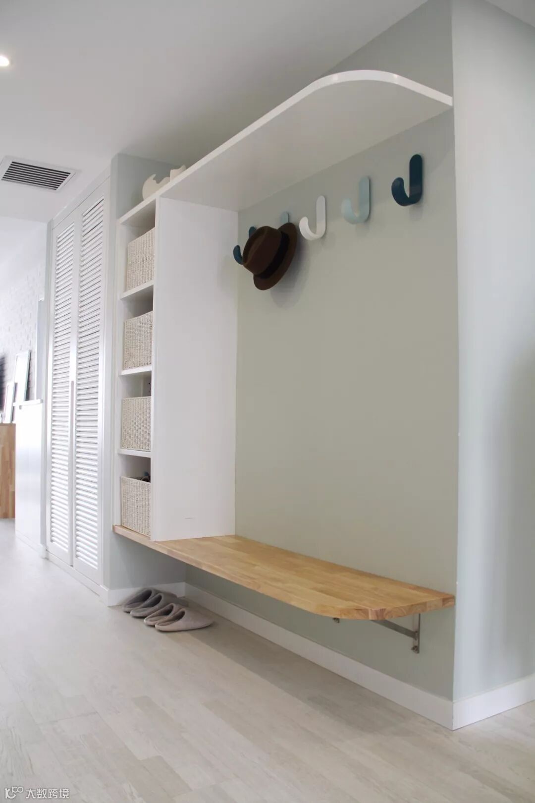 如果不装定制鞋柜,摆上成品鞋柜的话,那么矮柜鞋柜上方的空墙,也是可以用来安装挂钩的。