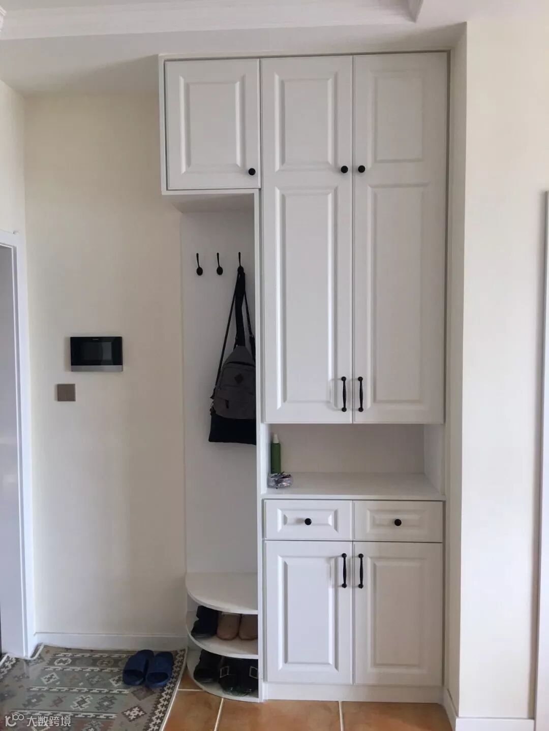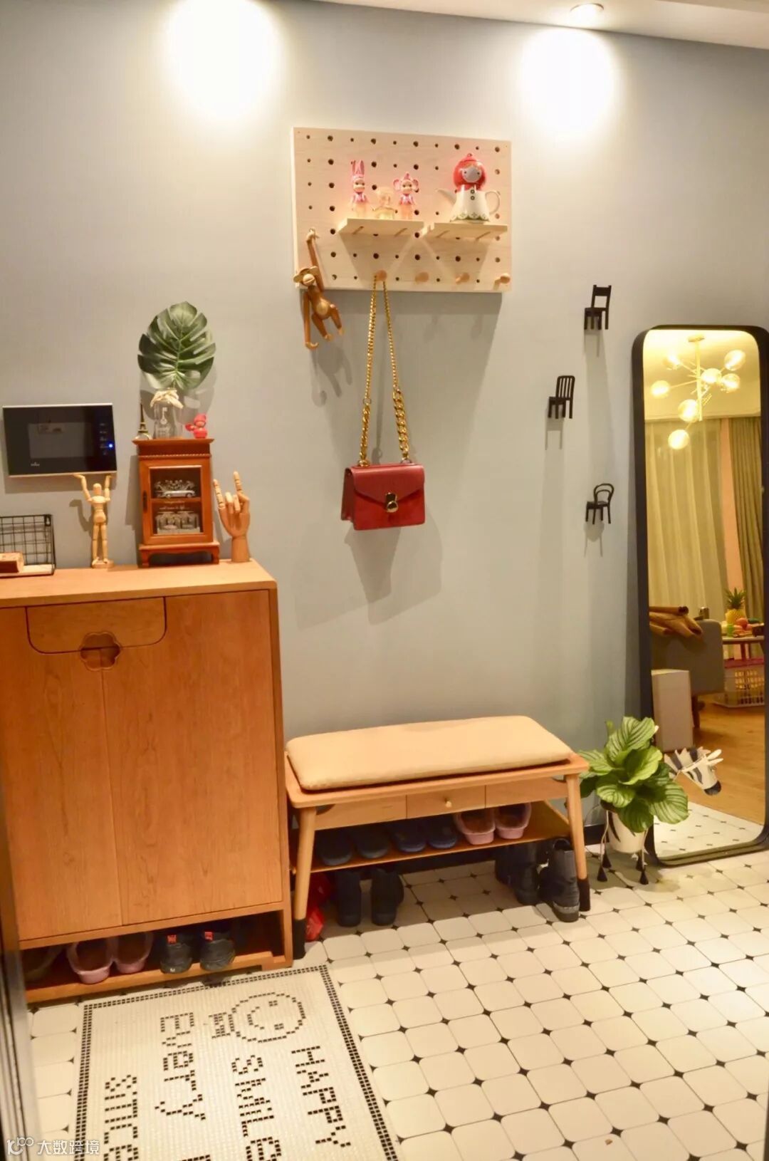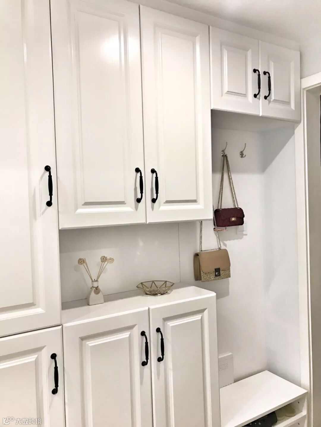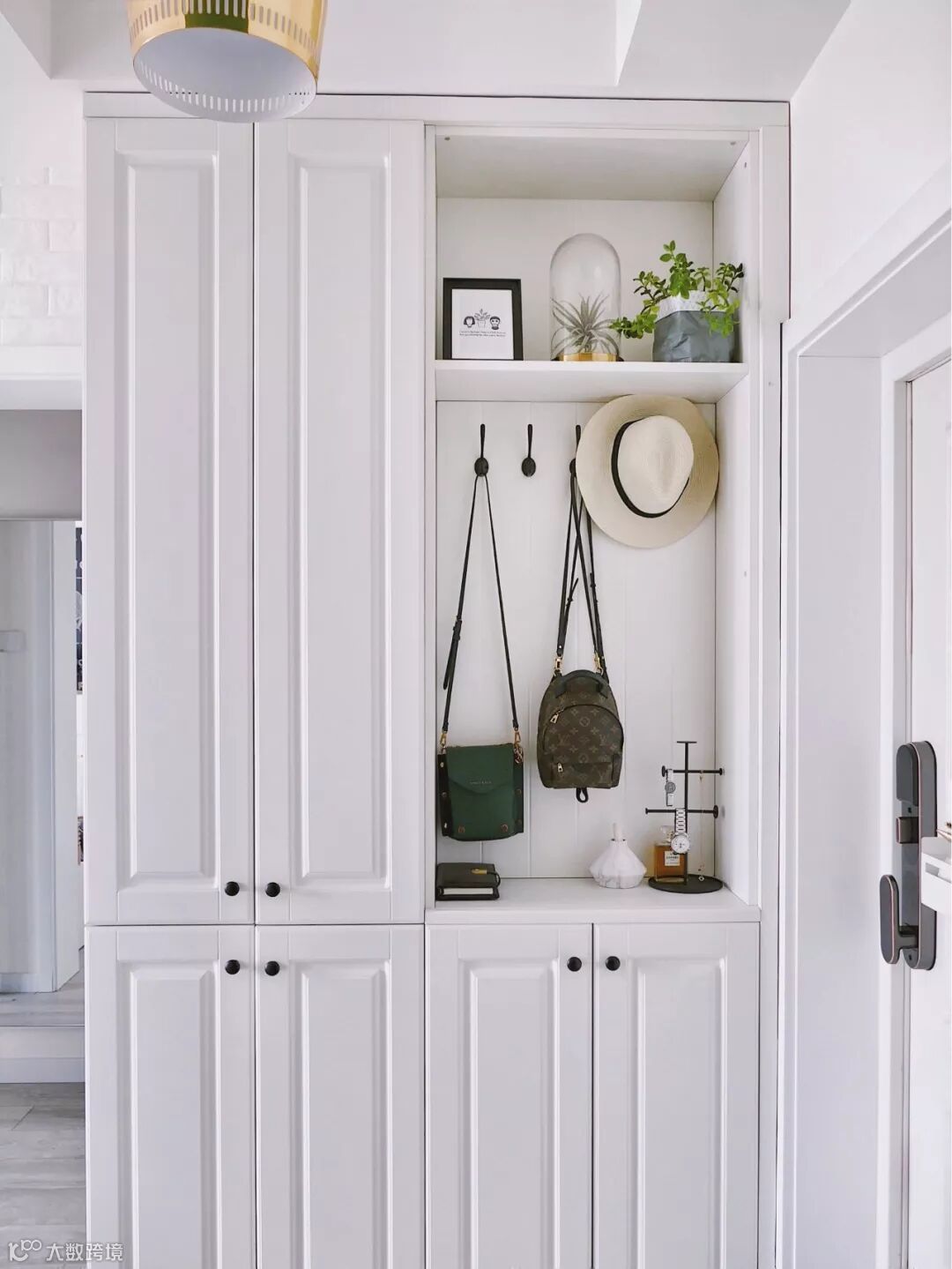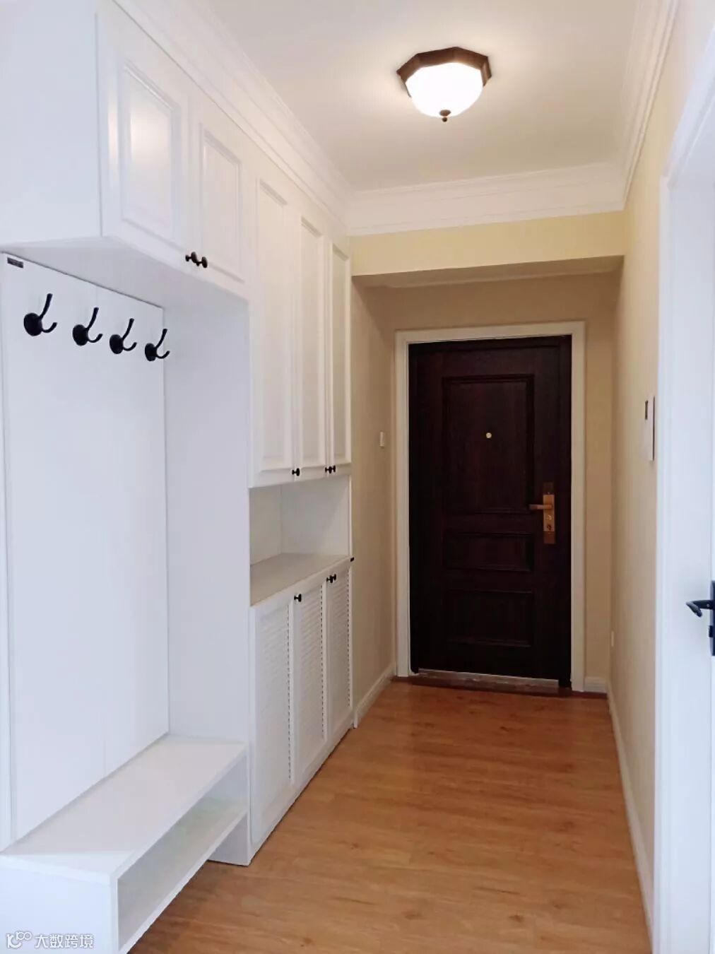 如果不装定制鞋柜,摆上成品鞋柜的话,那么矮柜鞋柜上方的空墙,也是可以用来安装挂钩的。