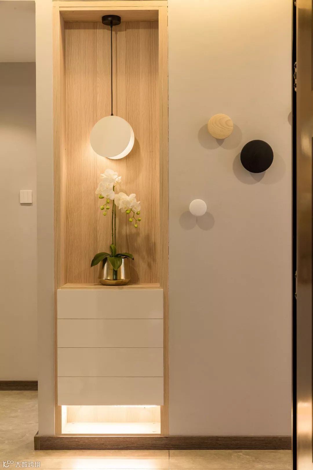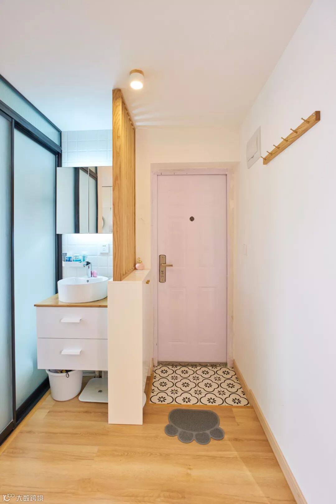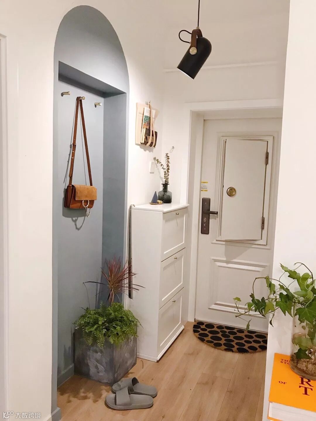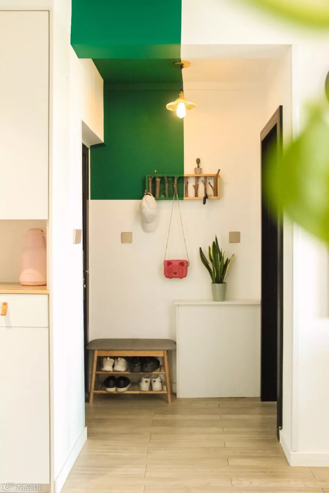 如果不装定制鞋柜,摆上成品鞋柜的话,那么矮柜鞋柜上方的空墙,也是可以用来安装挂钩的。