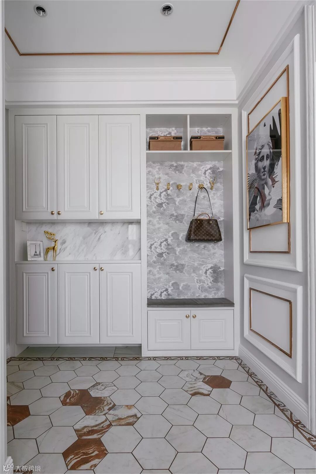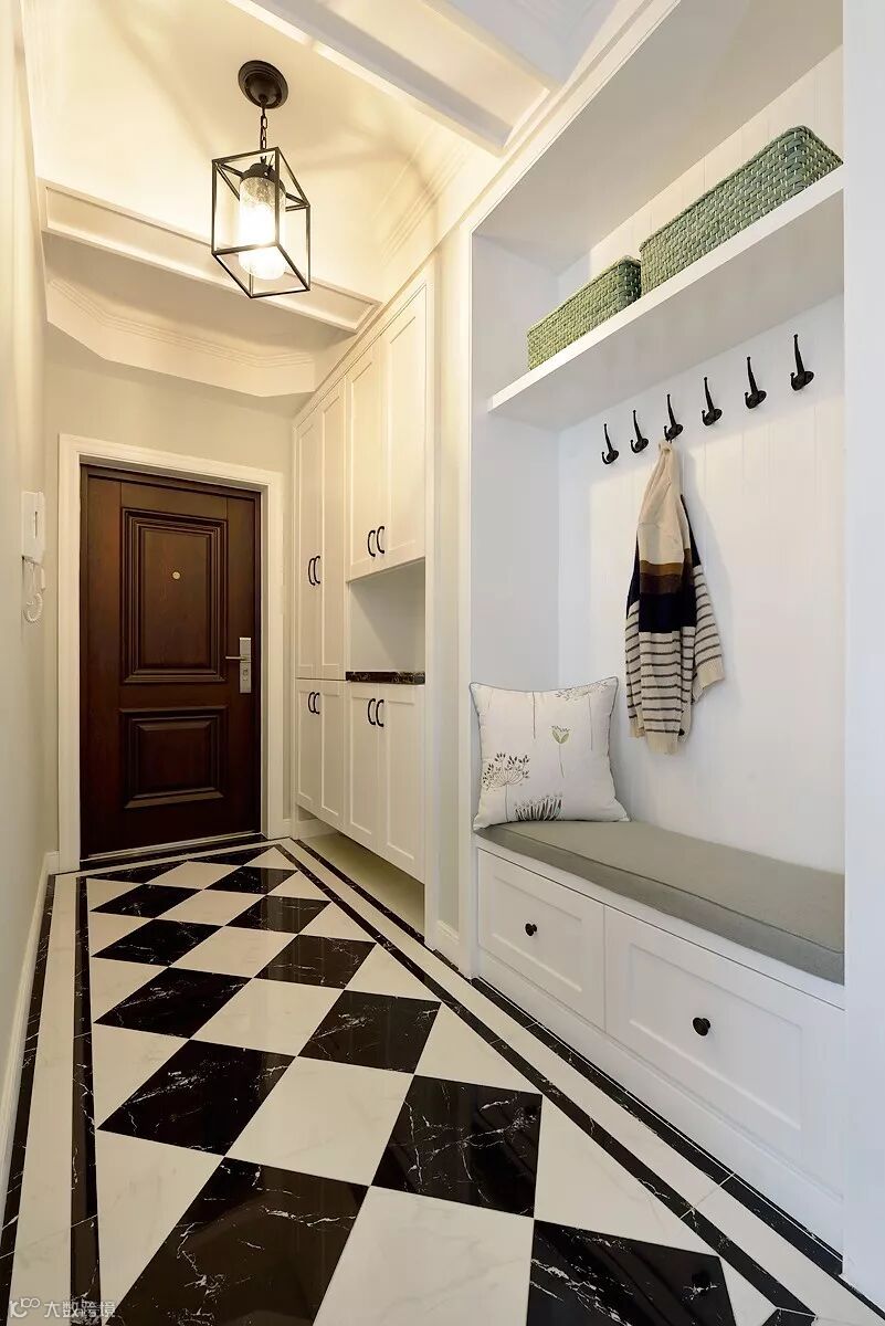 如果是定制鞋柜+换鞋凳组合的设计,那么在换鞋凳的后方,或者鞋柜留空的位置,就可以留个挂钩的安装位置,把挂钩装到这里,换鞋的时候顺手挂上去,用起来是非常的方便。