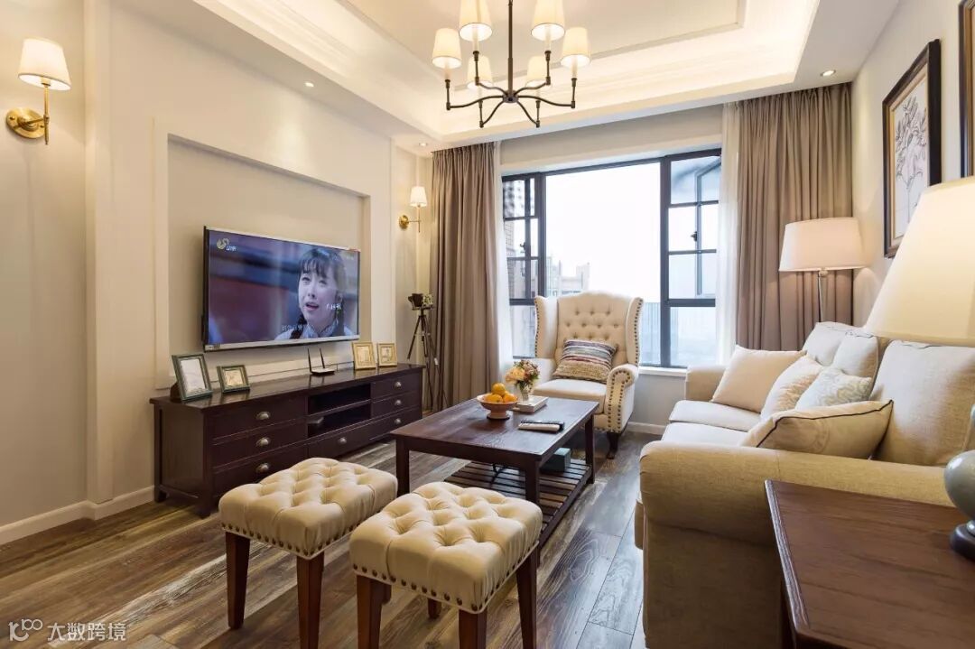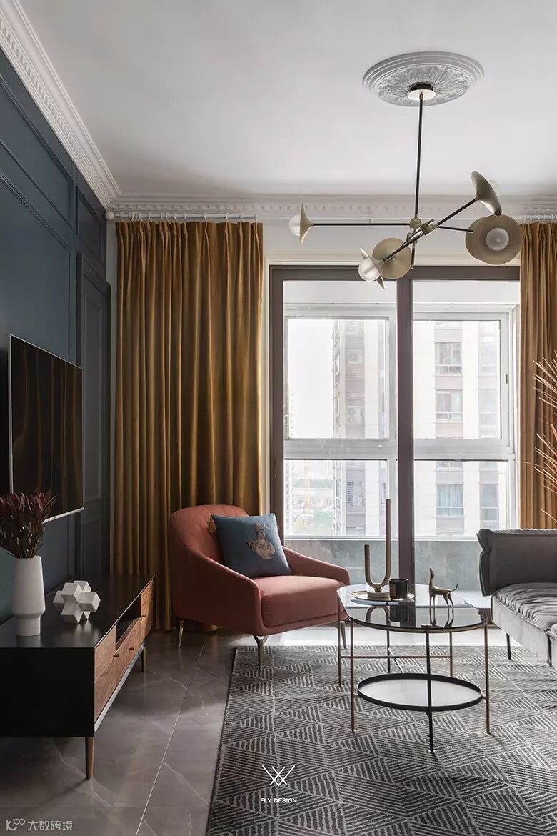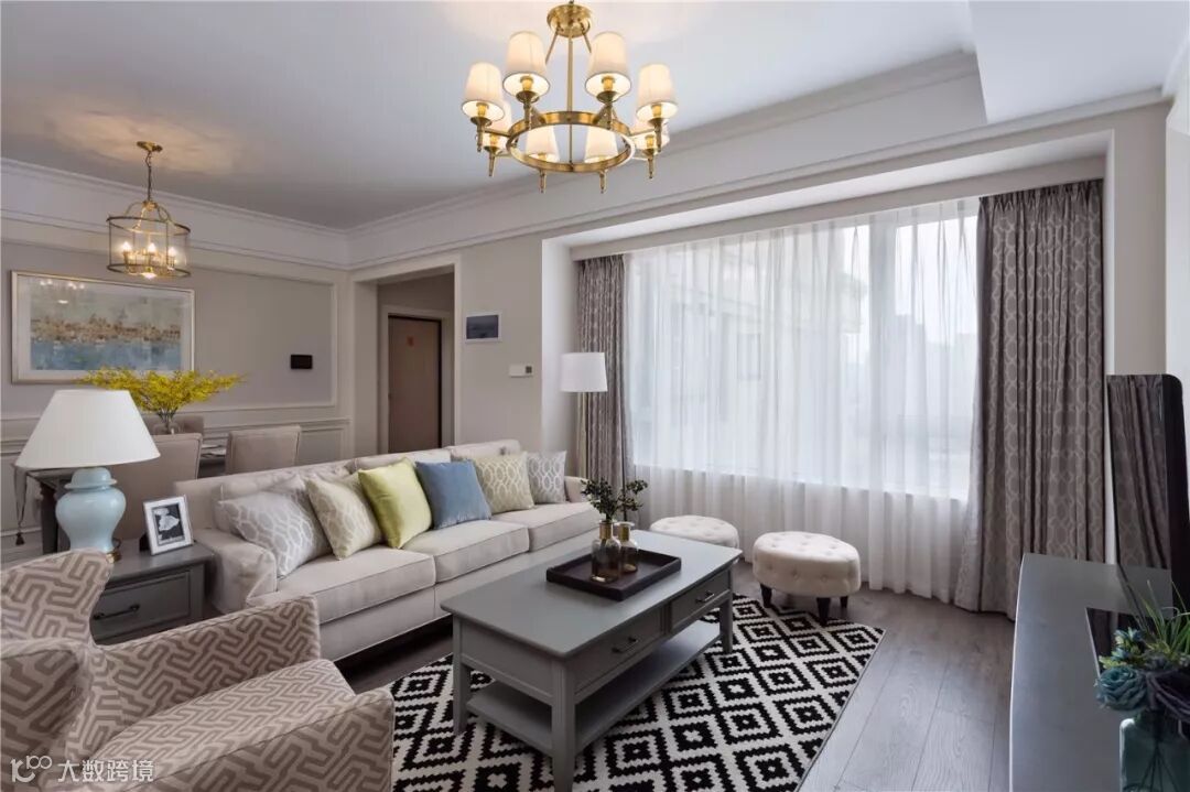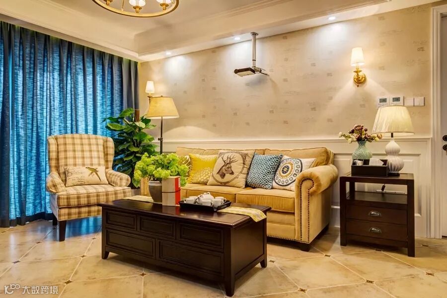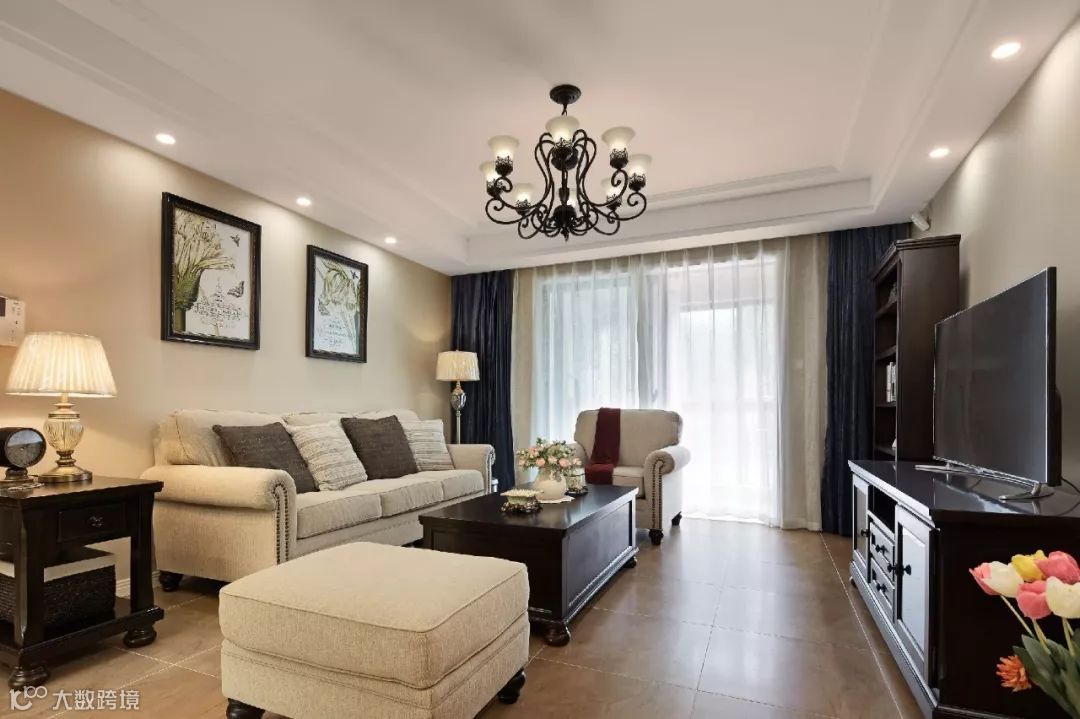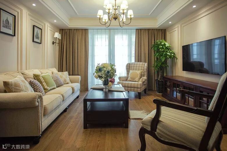 现代美式风格也是一种比较流行的设计,通过现代优雅的空间,搭配上美式元素质感的家居软装,可以使得空间温情而档次。在现代美式的客厅窗帘搭配中,多数都是以鲜艳活泼的色彩搭配为主,也有选择带花纹的窗帘布置,总体搭配比较华丽精致。