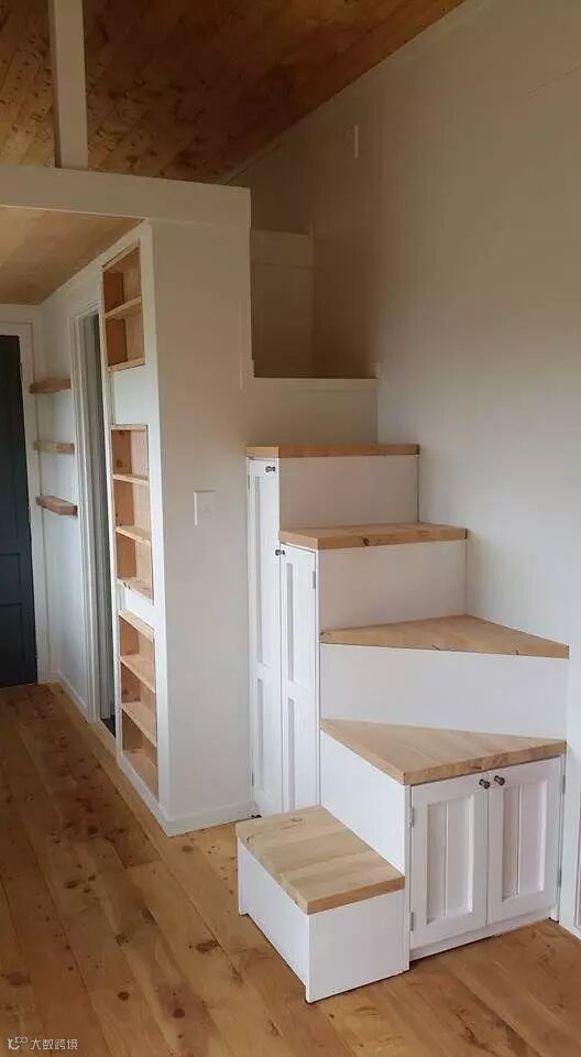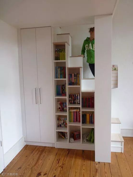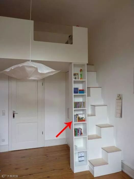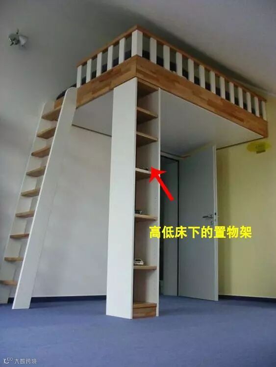 如果觉得这根突出的收纳置物架太占地,也可以将柱子挪个位置——挪到爬梯旁。