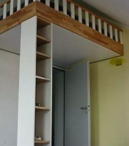 家里户型小,媳妇看到现在比较流行打造高低床来节省空间的设计,装修时就坚持要学着做,把床铺抬高2米,直接靠墙装门洞上!可是等媳妇让师傅装完,我却发现跟别人家的高低床有点儿不一样,支撑床的柱子竟然被媳妇悄悄改成了能收纳的置物架: