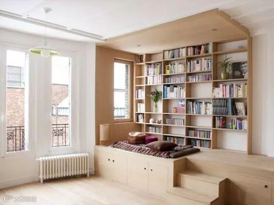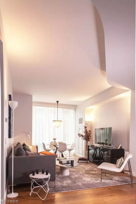 常用龙骨加石膏板的方式,从天花的四周向内围合,做成四周低中间高的吊顶造型,从而在视觉上形成扩容效果,使房间“变”高。