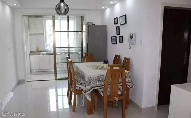 餐厅的墙上挂上装饰画,加上特别的吊灯,整个空间不再那么单调。