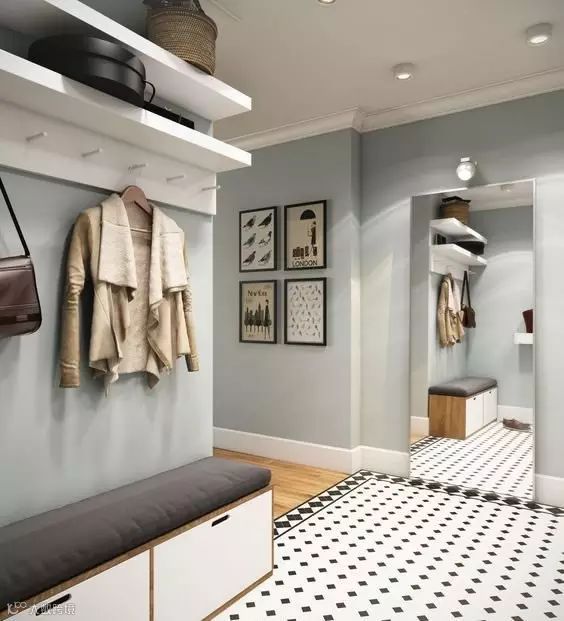 在留空区域安装几个挂钩,外套、帽子、包包等都有了合适的藏身之处,进出门的时候就再也不用跑到别的房间,轻松省事多了。