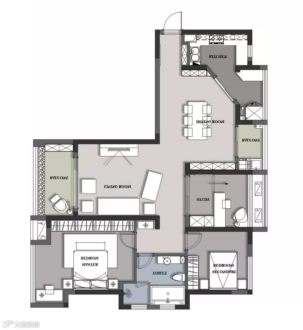 狭窄的过道经过改造设计,过道前段跟餐厅连接在一起,成为餐厅空间的一部分;过道中段的设置,保证客厅拥有两个采光源,成为客厅书房联系的纽带;过道后段位于梳洗室位置。空间与空间相通相融,实现了过道在此空间的消隐,美感度大大提高