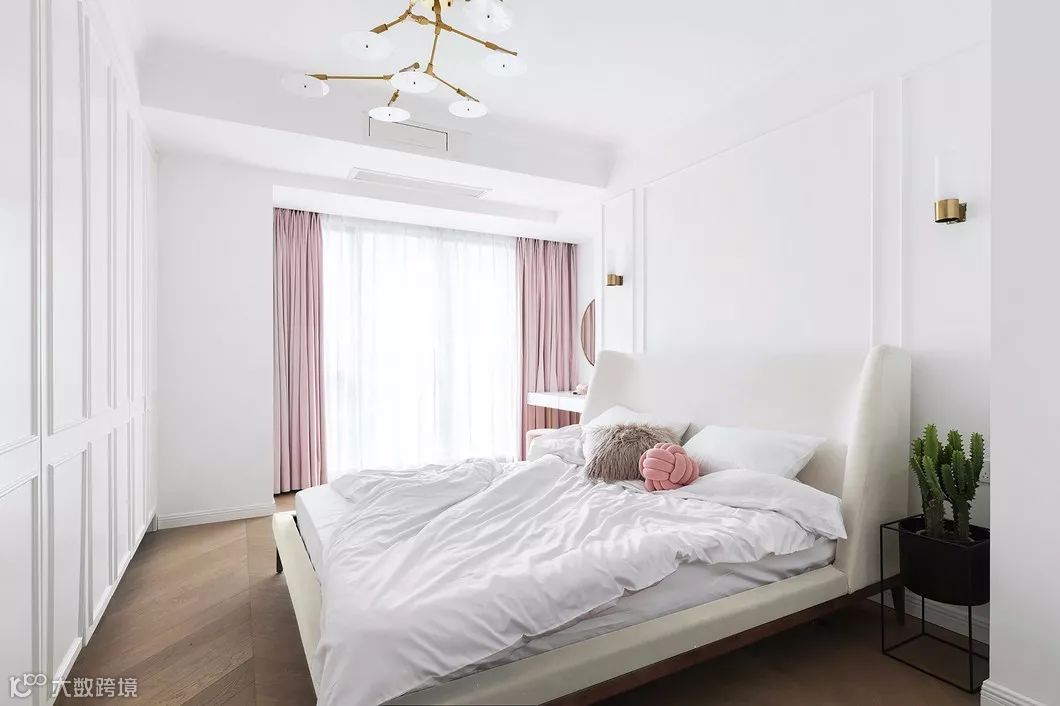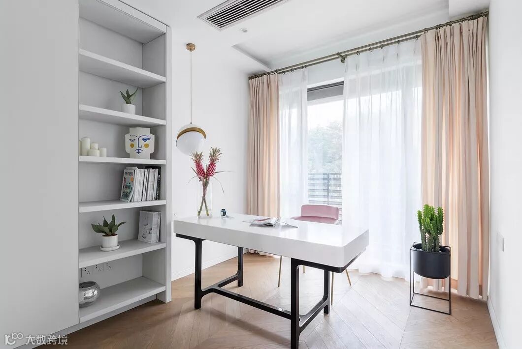 设置大面积的落地窗,弥补了书房采光不足的遗憾。自然白与茱萸粉和谐并存,力求用简单的色彩区别于其他现代风格的厚重感
