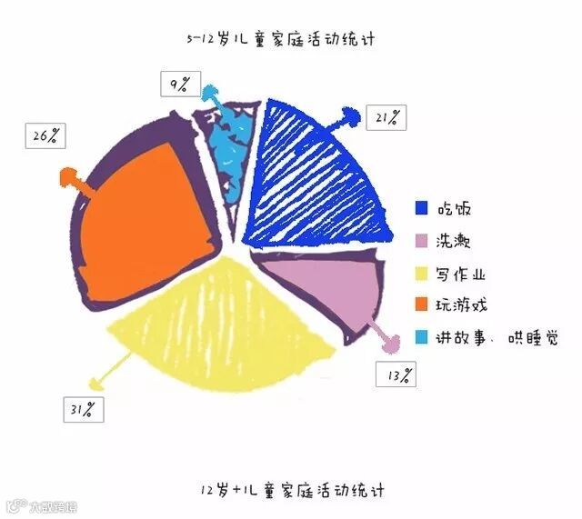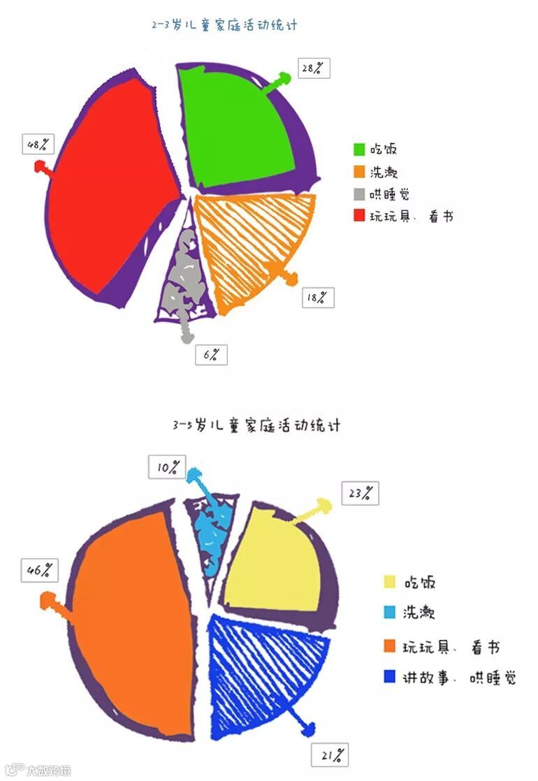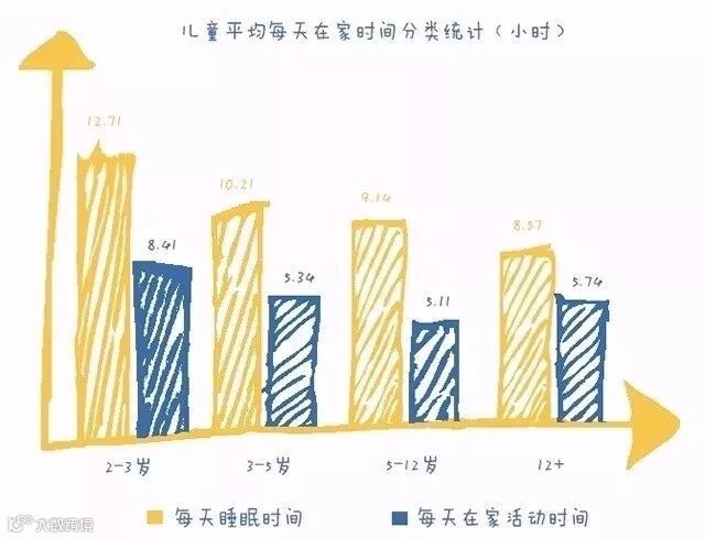 从下面这张图可以看出来,随着孩子年龄的增长,在家待的时间越来越短,其中大部分还是睡眠时间,活动时间只有5个小时左右。