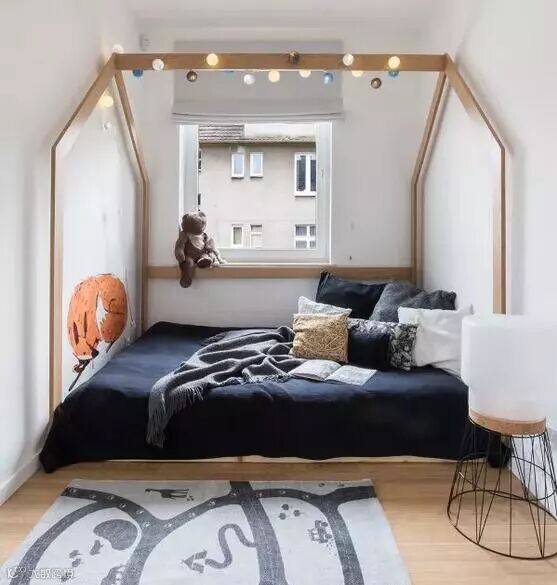 床:直接放一个够大够矮的床,滚下来也不会受伤,给孩子尽可能多的自由。也可以在矮床四周搭建上框架,会更有稳固感和安全感。