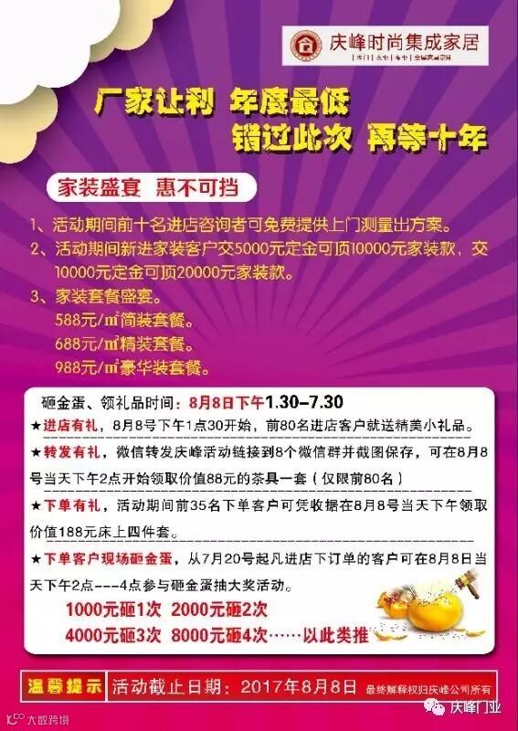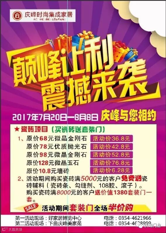 庆峰木门——“八月重头戏 建材巅峰让利”,在这个最美好的八月,向新老顾客回以最大的优惠。7月20日——8月8日,厂家让利,年度最低,为广大朋友献上最强特惠,等您来购!错过此次,再等十年!