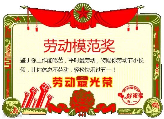 工作忙了吧?上班烦了吧?身体累了吧?鉴于你工作能吃苦,平时爱劳动,特赐你劳动节小长假,让你休息不劳动,心情愉快人轻松!