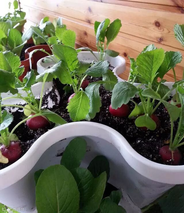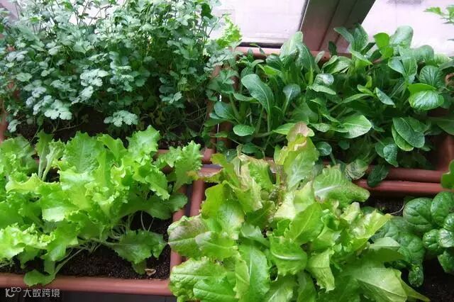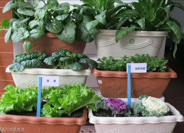 生菜啊、小白菜啊、莴苣啊、香菜啊、韭菜啊等等各种绿叶蔬菜分类各种一盆,既富有层次的美感又能吃到新鲜的绿色疏菜。