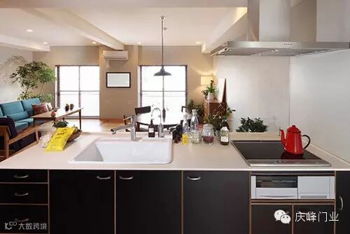 Tip:灶台下方的收纳柜,不仅具有防尘作用,还使得餐具的摆放更显整齐。灰色抽油烟机,现代感十足。橘红色的茶壶,色彩亮丽,引人眼球。