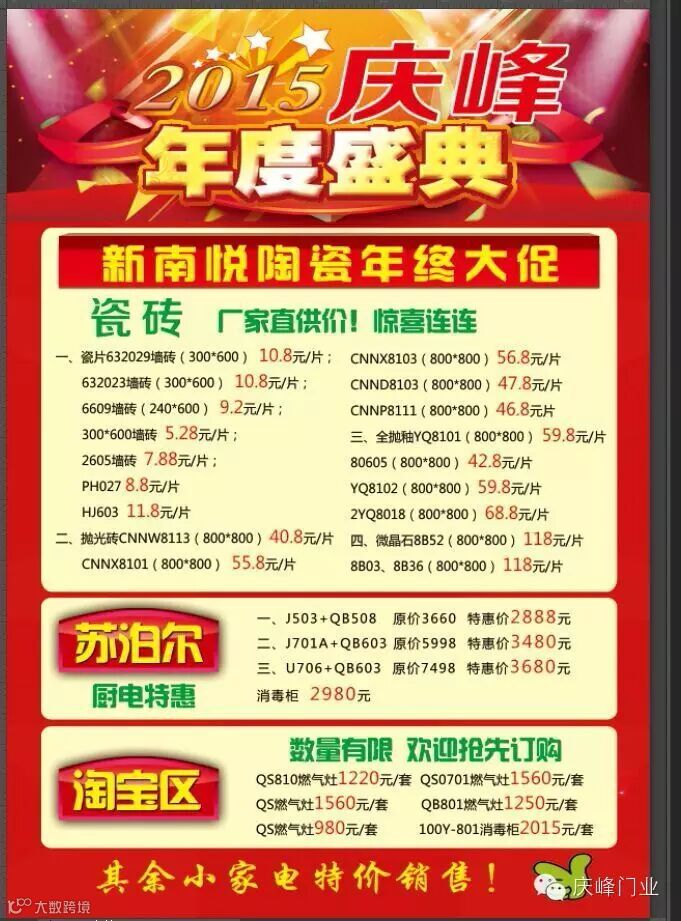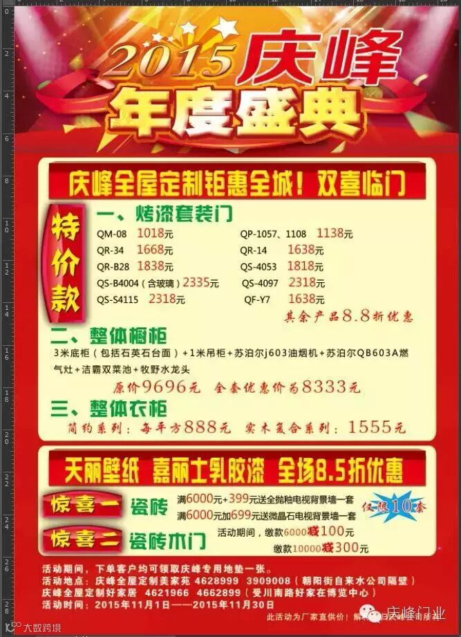 2015年度庆峰全屋定制“年度盛典、年终大促”活动将于11月1日—11月30日举行。新南悦陶瓷、苏泊尔电器、庆峰烤漆套装门、庆峰橱柜、庆峰衣柜、天丽壁纸统统厂家直供价,惊喜连连,优惠多多!