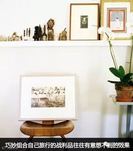 如果你是一个爱旅游的人,相信你从全国各地带回来的旅行纪念品能为你的墙壁添光添彩。带着地方特色的玩偶饰品很具有童趣和民族风,而摆放自己旅行中的摄影作品也别具一番味道。