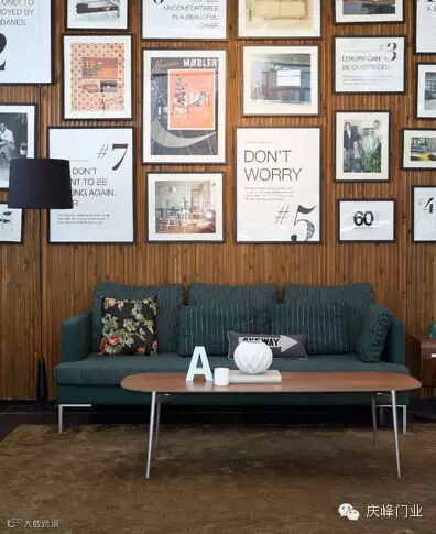 装饰tips:不局限于单幅的画作,而是将多幅大小不一的作品组合。客厅统一的黑色画框让整个空间具有视觉上的统一感,用木做墙面的底板,是照片非常好的搭配手法,将画铺满整面墙,可以丰富单调的立体空间,渲染出艺术的美感。