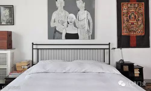 装饰tips:创意的素描手法勾勒出床头墙面的大幅家庭画像,有种怀旧风格,悬挂于墙面的正中间,非常符合空间对称的视觉感和平衡感。