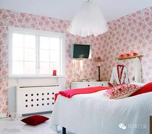 红色玫瑰在墙面上粲然绽放,成为卧室空间里的绝对亮点,为纯白的空间注入柔美烂漫的气息。有了这般抢眼的主题墙面设计,卧室中的家具和配饰就变得纯粹而简单起来,搭配白色的床,以及本白色调的木地板,演绎出一派纯美恬静的空间感觉。