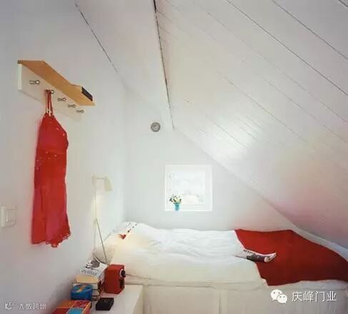 斜房顶下的小空间里同样也是布置简约化的卧室。白净的色彩给人很纯净的感觉,而床上红色的盖毯、床头红色的连衣裙,还有其他红色的装饰品,让卧室充满了勃勃生机。