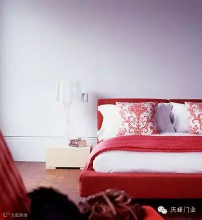这间卧室同样运用了红色与白色的对比配色,这样就不会因为红色的出现而过于温暖,也不会因白色的出现而显得单调。用印花图案的靠垫作为调剂,在整个热烈的色彩中加入一点变化,让卧室呈现出最鲜亮的一面。