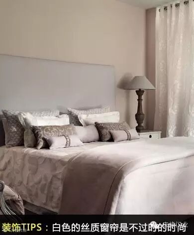 装饰TIPS:白色的丝质窗帘是不过时的时尚。透明类的丝质面料,手感柔软、纹路流畅,用做窗帘,既浪漫又高雅。床品融入了一抹淡淡的灰,为雅致的卧室增添跳动色彩。