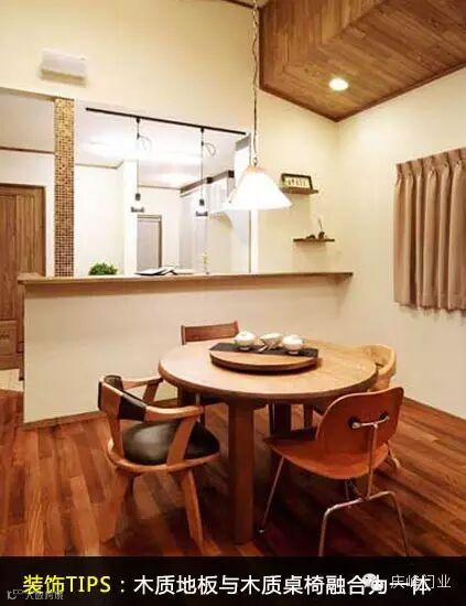 装饰TIPS:木质地板与木质桌椅融合为一体,在炎炎夏季带来树木的清爽感。白色墙壁使这种清爽感更进一层,而桌上吊灯则带来温馨的感觉。造型独特的四把椅子也是装饰的亮点。