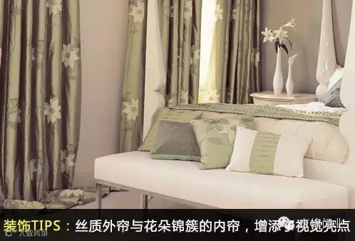 装饰TIPS:素雅的花朵静静地绽放在淡绿色的丝绸面料上,遮挡阳光的同时,遗漏的光线使得窗帘流光溢彩。丝质外帘与花朵锦簇的内帘,增添了视觉亮点。