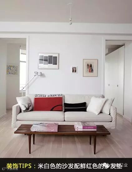 装饰TIPS:白色的墙壁、天花板,在淡杏色的木地板的衬托下,共同构成温暖的家居。米白色的沙发上鲜红色的沙发垫,让人的视线瞬间集中到沙发处。颜色的巧妙搭配让装饰既清爽又有亮点。
