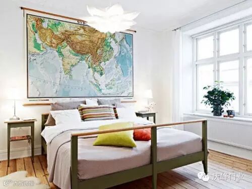 卧室的墨绿木床设计,淡雅简单。
