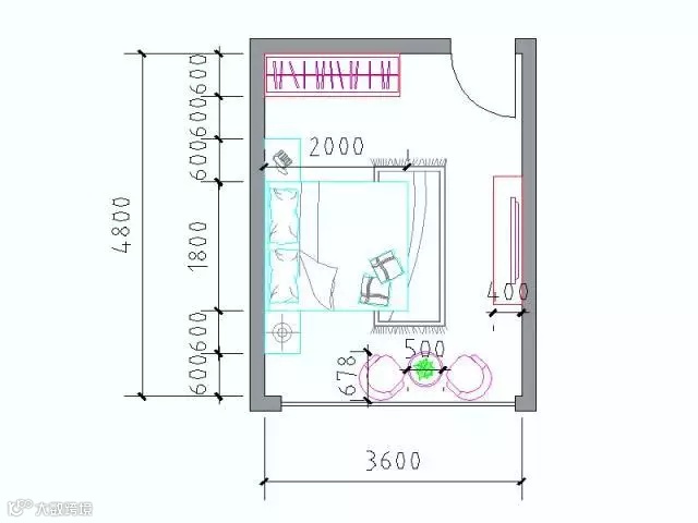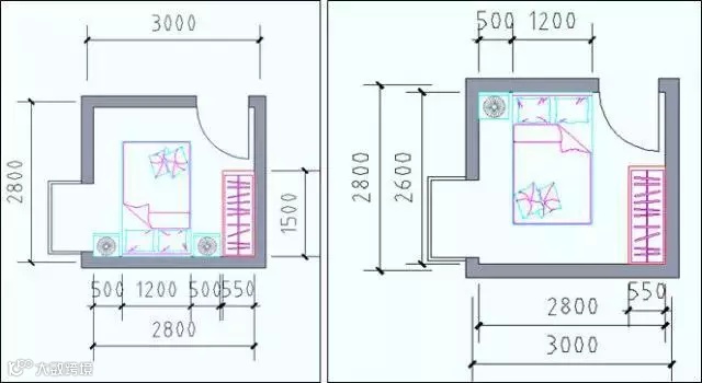 ②进深:床宽1500mm+床头柜1200mm+衣橱600m,尺寸≥3300m