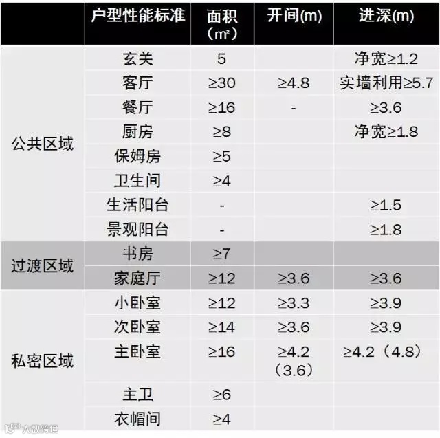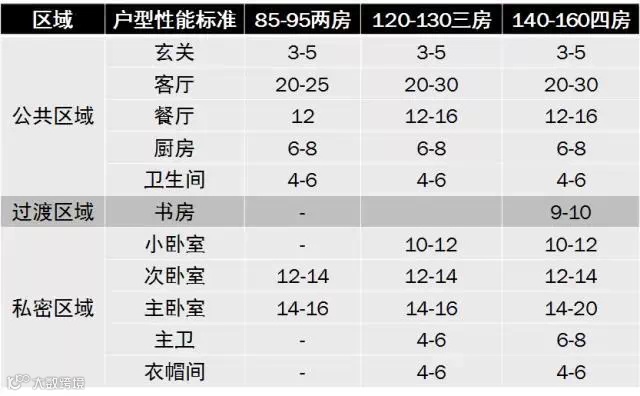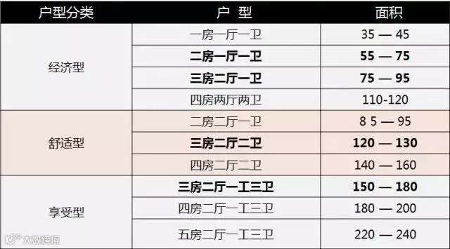 针对以上各种三种户型功能尺寸细分,对各个户型面积段做以下户型面积建议: