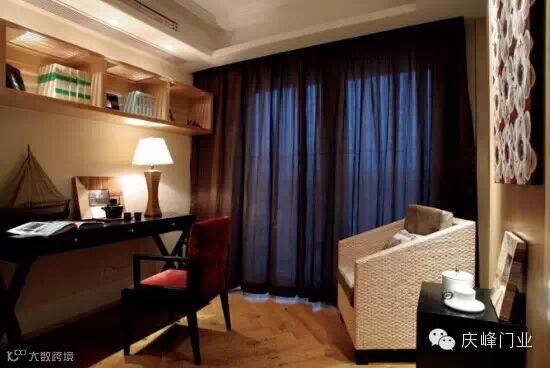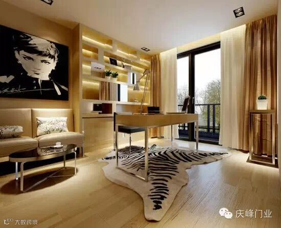 奥黛丽赫本的装饰图案挂画,使书房的档次无形中增加了国际范;虎纹的地毯,彰显着主人的霸气,节约实用的书架无一不在展现主人的人格魅力,果断而利落。