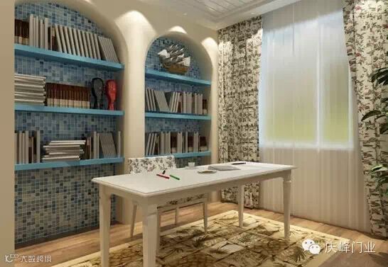 一般80、90的小青年都比较喜欢小清新的一些书房装修,地中海风格的书房正是满足了这一条件,蓝与白是典型的色彩搭配,轻快明亮,带人无限的清凉舒适。