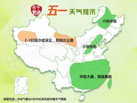中央气象台预计,五一假期期间,我国中东部地区有一次明显降雨过程,广西、广东、湖南、江西、安徽、湖北、福建、河北、江苏、河南等10省市的部分地区有大到暴雨,局地并伴随强对流天气。同时,北方地区降温4-8℃,南疆、甘肃等地有扬沙或浮尘。需要关注对交通出行、旅游的不利影响。