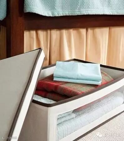 床下那么多的空间可不能白白放弃了,存储一些反季节的物品,比如换季的时候用来放置厚实的冬被。带盖子的帆布箱可以有效防止灰尘,一面的透明材质则能清晰看间里面所收纳的物品。