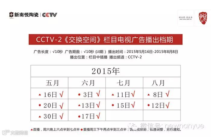 CCTV中央电视台,作为全国覆盖面广、公信力强的媒体,对强化品牌地位,推动品牌建设有着重要作用。新南悦陶瓷登陆CCTV-2《交换空间》,高端定位进一步展示品牌的实力,提升品牌知名度,促进终端销售,为打开国际市场迈开重要一步。