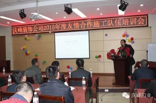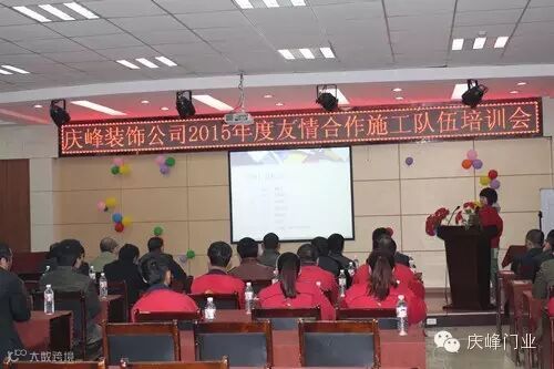 庆峰装饰公司2015年度友情合作施工队伍培训会,于2015年3月18日上午9:00在庆峰快捷酒店七楼会议室举行。友情合作施工队所有人员及庆峰公司工作人员全部与会。