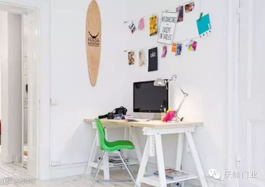 拐角处的空闲之地,放上简易的书桌椅就成了很好的工作区域,白色的墙面有点单调,那么不妨装饰上自己手工制作的简易照片串。点缀空间增加丰富感。