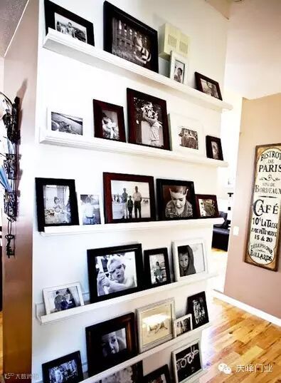 不用固定于墙壁,用搁架也能成就一面整齐的照片墙,将搁架平行安置在墙壁上,再将相框整齐排列于上即可,不仅方便制作还能随时更换。