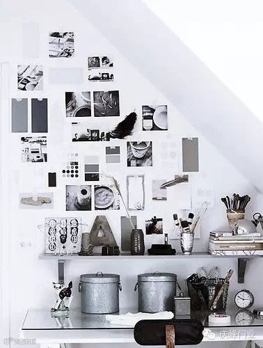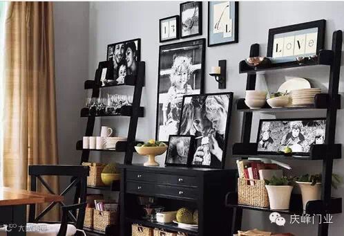 将搁板制作成楼梯造型, 从上到下依次摆放起到很好的收纳之用。将黑白照片代替彩色照片,在一个相框中放一张照片,组合成一个画面,营造了一种怀旧感。