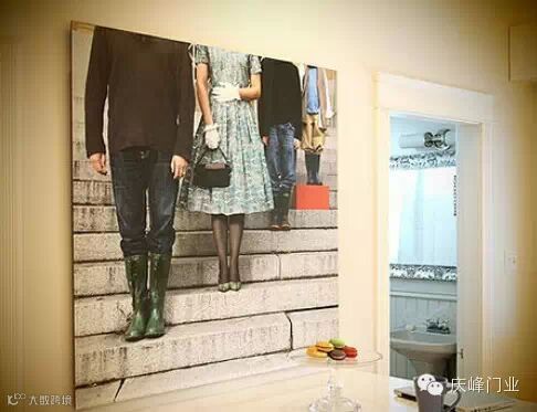 案例首先打破常规,照片墙不一定是一张张排满的相框,将相片几倍放大,能达到更加醒目、更具个性的墙面装饰效果。选择较有创意的家庭合照,放大悬挂在家中的某个常活动的角落,如餐桌旁就很不错。