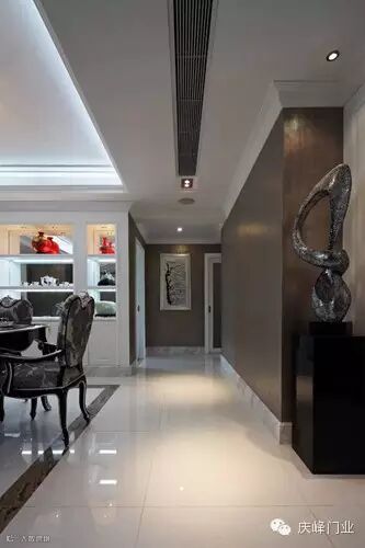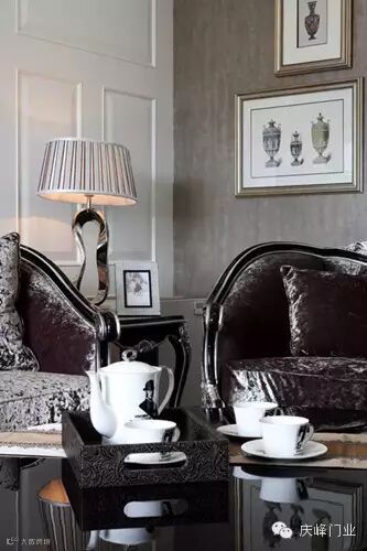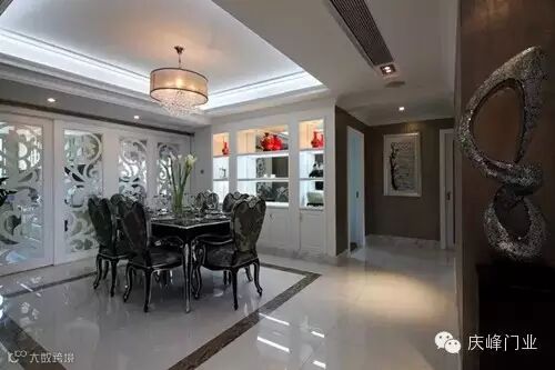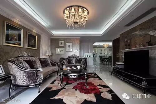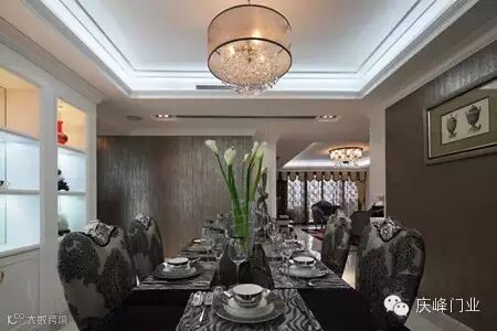 冷暖的色彩搭配,冷暖的灯光搭配,典型欧式风格中的线条以及大理石饰面,镶银边的深色后现代欧式组合沙发,配合水晶吊灯,空间中的装饰画已经其他饰品经过精心的挑选,很柔和的融入了整个空间的色调中,客厅显得庄重,毫不张扬,却从中透露出一种淡淡的奢华感。