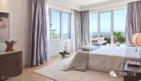 卧室落地窗:这个卧室有落地窗和推拉窗,采光极佳,风从外面吹进来,卧室里面都可以形成对流,通风效果好,而外面的阳台视野非常开阔,落地窗让卧室阳台连为一体,使卧室空间看起来更大,室外的景观也更好欣赏。