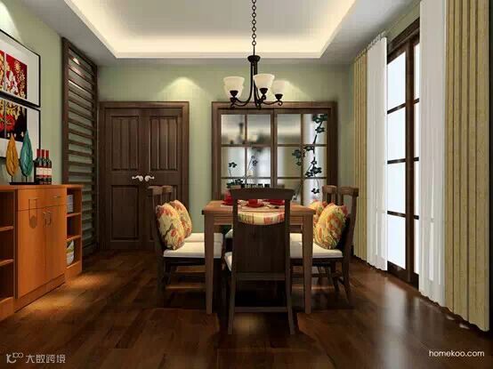 木质长桌与风格朴实的餐椅,材质轻盈的吊灯淡化了木质桌子的厚重感,从而成为了整个餐厅的点睛。暖色调的大范围使用让餐厅充满了一种温馨的氛围。