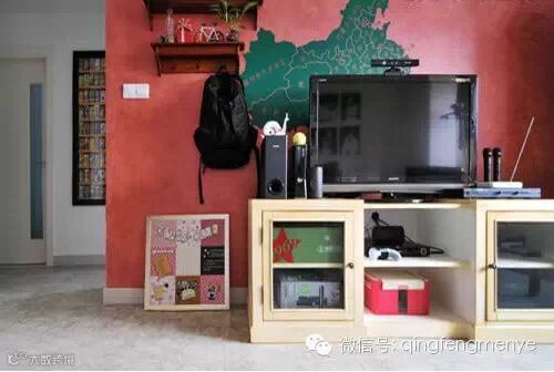 装饰tips:除了照片墙装饰,简洁的墙绘也能变得创意十足,整面墙以红色为底色,搭配绿色中国地图,趣味性十足。