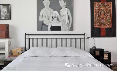 装饰tips:创意的素描手法勾勒出床头墙面的大幅家庭画像,有种怀旧风格,悬挂于墙面的正中间,非常符合空间对称的视觉感和平衡感。