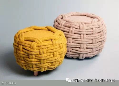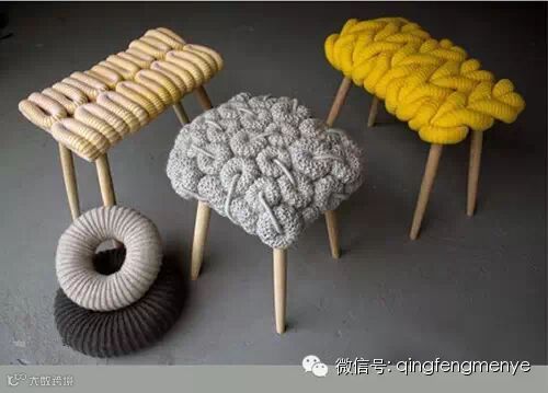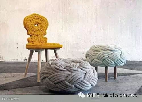这样的一个羊毛椅子组合,也不失为两件特色摆件哦,看那俏皮的橘红色,在寒冷的冬天,不正是需要这样的颜色吗?还有那个圆凳子那全身包裹的羊毛线,我想就算不坐上去,光是抱在身上就会很暖和吧。