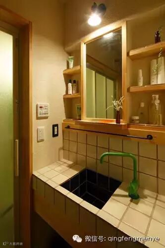 浴室的洗手台选用了墨西哥瓷砖,硅藻土墙壁配上木制壁柜,显得清新自然。